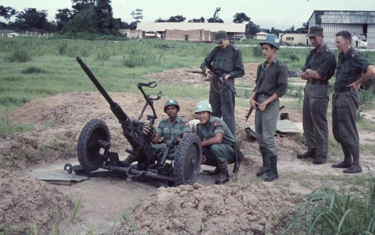 Svenska bataljonen i Kongo 1961 hade vid flera tillfällen haft bekymmer med katangesiskt flyg som b.la släppt ner handgranater i glasburkar mot svenskarna. Man beslutade därför att vid rotationen senhösten 1961 så skulle den kommande bataljonen XIV förstärkas med två luftvärnstroppar utrustade med svenska Boforskanoner. En av tropparna kom inledningsvis att placeras på Elsibethvilles flygplats och den andra på den svenska campen i Elisabethville. När förbandet våren 1962 efter att ha deltagit i striderna under decemberstressen 1961 flyttades till Kaminabasen så följde luftvärnet med. Bilden är från Elisabethvilles flygplats och visar hur svenskarna visar en av Boforskanonerna för nyfikna FN-kollegor från en annan nation. Bilden är tagen av Ernst Dahl från Malmö som tillhörde luftvärnet under XIV Kongo. Ernst hade tidigare även tjänstgjort vid bataljon IV i Gaza. Tyvärr har han nu lämnat oss men hans berättelse lever kvar med oss.