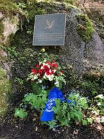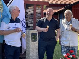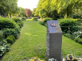 Minnesplats med minnessten i Stadsparken vid ån på det som kallas Veteranholmen. Nyinvigning 2023.